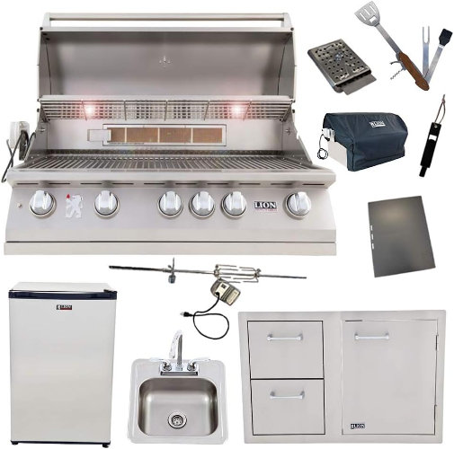 Lion Premium Grills L60000 Built In Liquid Propane BBQ Grill Package with Door Drawer Combo, Double Side Burner, Vertical Door, Bar Sink, and Refrigerator
